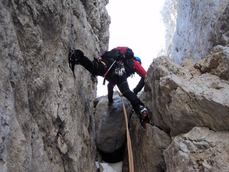Tras la zona de nieve blanda llegamos al primer resalte a 1800 metros y tras la primera hora de corredor (había leído que dicho resalte era el que nos iba a orientar sobre como podían estar el resto y que era el más difícil). Pero realmente no me pareció muy dificultoso; se trataba de pasar por la derecha un bloque empotrado de algo mas de un par de metros en el que más que fuerza era tirar de técnica en los agarres de la pared de la derecha buscando fisurillas y algún que otro bloque más pequeño que se protegen bien con un fisurero mediano.